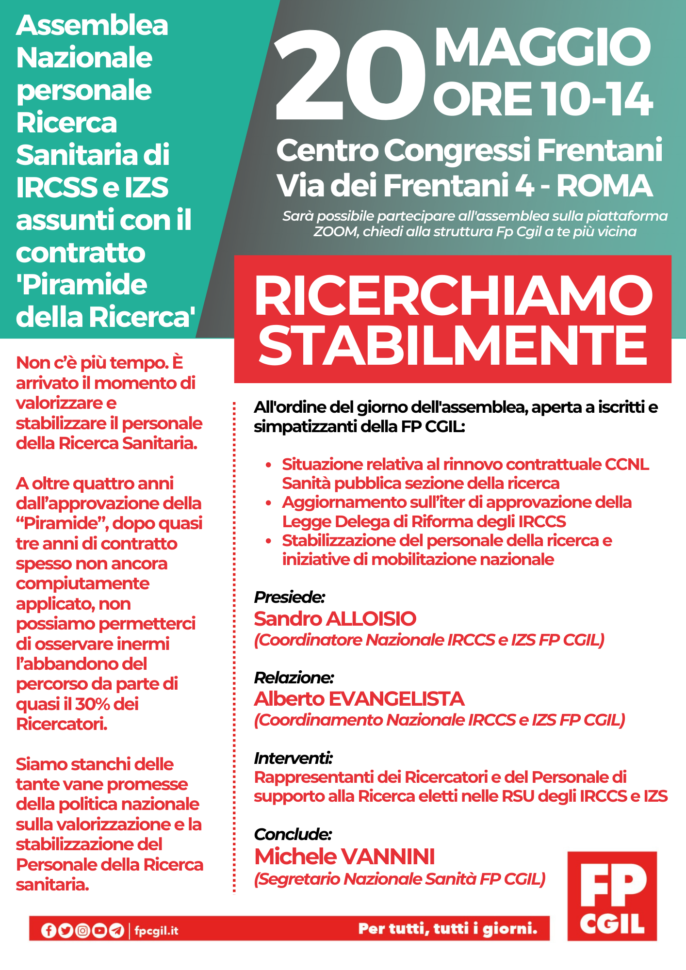 20 mag. 2022 – “Eravamo 3500 tra cococo, partite iva e borsisti più o meno a maggio 2017, abbiamo firmato in 1800 la piramide, oggi siamo rimasti in 1290. Quindi gli istituti hanno perso il 65% della forza storica della ricerca in 5 anni. Da una survey che avevamo condotto questo dicembre, in occasione della legge di bilancio, su un campione statistico di 500 ricercatori, poco meno della metà degli esistenti, il range di anzianità precaria oggi va da 5 a 32 anni, con una media nazionale di 10, l’80% sono donne. Questa terza bocciatura in 5 mesi non ci va giù, neanche un po’ e non andrà giù: da qui alla prossima legge di bilancio ci dovrà essere uno stillicidio di mobilitazioni! C’è qualcuno che non la vuole la nostra stabilizzazione e noi riteniamo che siano quelli che hanno pensato l’impianto della piramide della ricerca. Ma noi non possiamo non portare a casa la stabilizzazione. Siamo in 1290 e abbiamo 12.900 anni di precarietà, abusi contrattuali con la pubblica amministrazione”. Così Francesca Colciaghi, ricercatrice precaria del Besta di Milano e neo Rsu, all’assemblea “Ricerchiamo stabilmente” organizzata questa mattina dalla Fp Cgil nazionale al Centro Frentani e on line, e che ha coinvolto da tutta Italia circa 200 lavoratrici e lavoratori della ricerca sanitaria di Ircss e Izs assunti con contratto a “piramide” (5 anni + 5 a tempo determinato).