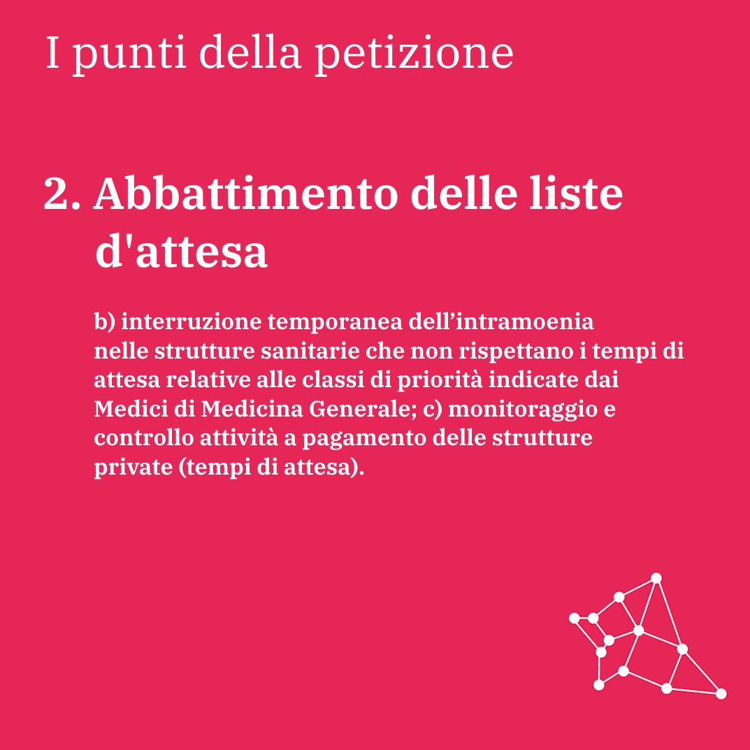 Abbattimento delle liste d’attesa: a) attraverso un periodico controllo, da parte di Regione e Ats, sulle strutture pubbliche e private accreditate, per verificare: che non siano chiuse le agende, pratica vietata dell’attuale legislazione; la corretta gestione dei fondi nazionali e regionali destinati all’abbattimento delle liste d’attesa; l’assenza di qualunque pratica finalizzata a trasferire la richiesta del cittadino/a dal pubblico al privato; b) interruzione temporanea dell’intramoenia nelle strutture sanitarie che non rispettano i tempi di attesa relative alle classi di priorità indicate dai Medici di Medicina Generale; c) monitoraggio e controllo attività a pagamento delle strutture private (tempi di attesa).