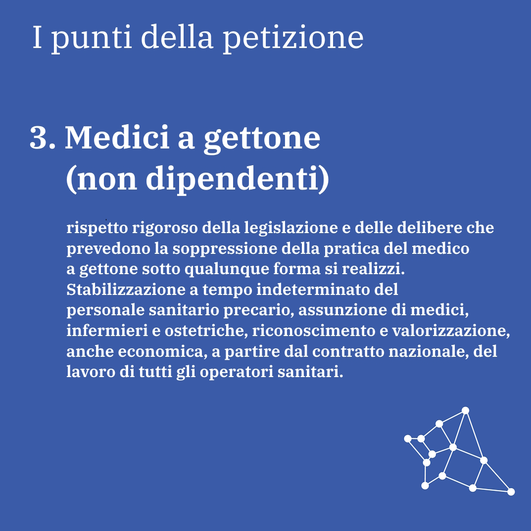 Medici a gettone (non dipendenti): rispetto rigoroso della legislazione e delle delibere che prevedono la soppressione della pratica del medico a gettone sotto qualunque forma si realizzi. Stabilizzazione a tempo indeterminato del personale sanitario precario, assunzione di medici, infermieri e ostetriche, riconoscimento e valorizzazione, anche economica, a partire dal contratto nazionale, del lavoro di tutti gli operatori sanitari.