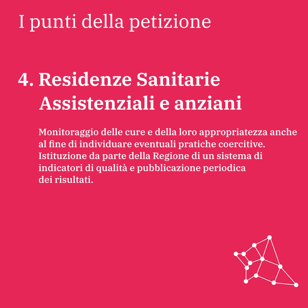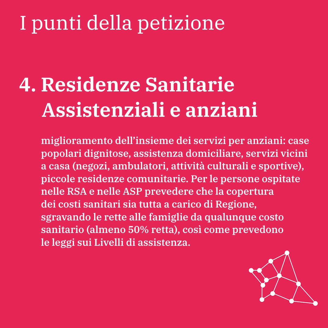 Residenze Sanitarie Assistenziali e anziani: miglioramento dell’insieme dei servizi per anziani: case popolari dignitose, assistenza domiciliare, servizi vicini a casa (negozi, ambulatori, attività culturali e sportive), piccole residenze comunitarie. Per le persone ospitate nelle RSA e nelle ASP prevedere che la copertura dei costi sanitari sia tutta a carico di Regione, sgravando le rette alle famiglie da qualunque costo sanitario (almeno 50% retta), così come prevedono le leggi sui Livelli di assistenza. Monitoraggio delle cure e della loro appropriatezza anche al fine di individuare eventuali pratiche coercitive. Istituzione da parte della Regione di un sistema di indicatori di qualità e pubblicazione periodica dei risultati.