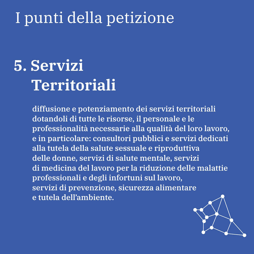 Servizi Territoriali: diffusione e potenziamento dei servizi territoriali dotandoli di tutte le risorse, il personale e le professionalità necessarie alla qualità del loro lavoro, e in particolare: consultori pubblici e servizi dedicati alla tutela della salute sessuale e riproduttiva delle donne, servizi di salute mentale, servizi di medicina del lavoro per la riduzione delle malattie professionali e degli infortuni sul lavoro, servizi di prevenzione, sicurezza alimentare e tutela dell’ambiente.