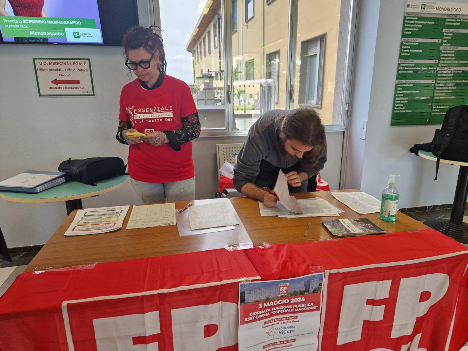 3 mag. 2024 – Una giornata intera in Asst Crema. La Funzione Pubblica Cgil Cremona questa mattina all’Ospedale Maggiore ha raccolto firme a tutto spiano. Sia per la petizione “La Lombardia Sicura”, che vuole mettere al centro il diritto alla salute delle persone facendo cambiare passo alla sanità regionale (con l’istituzione di un Centro unico di prenotazione per le strutture pubbliche e private, l’abbattimento delle liste d’attesa, lo stop ai medici gettonisti, il miglioramento dei servizi per anziani, a partire dalle Rsa, e il potenziamento capillare della sanità territoriale).