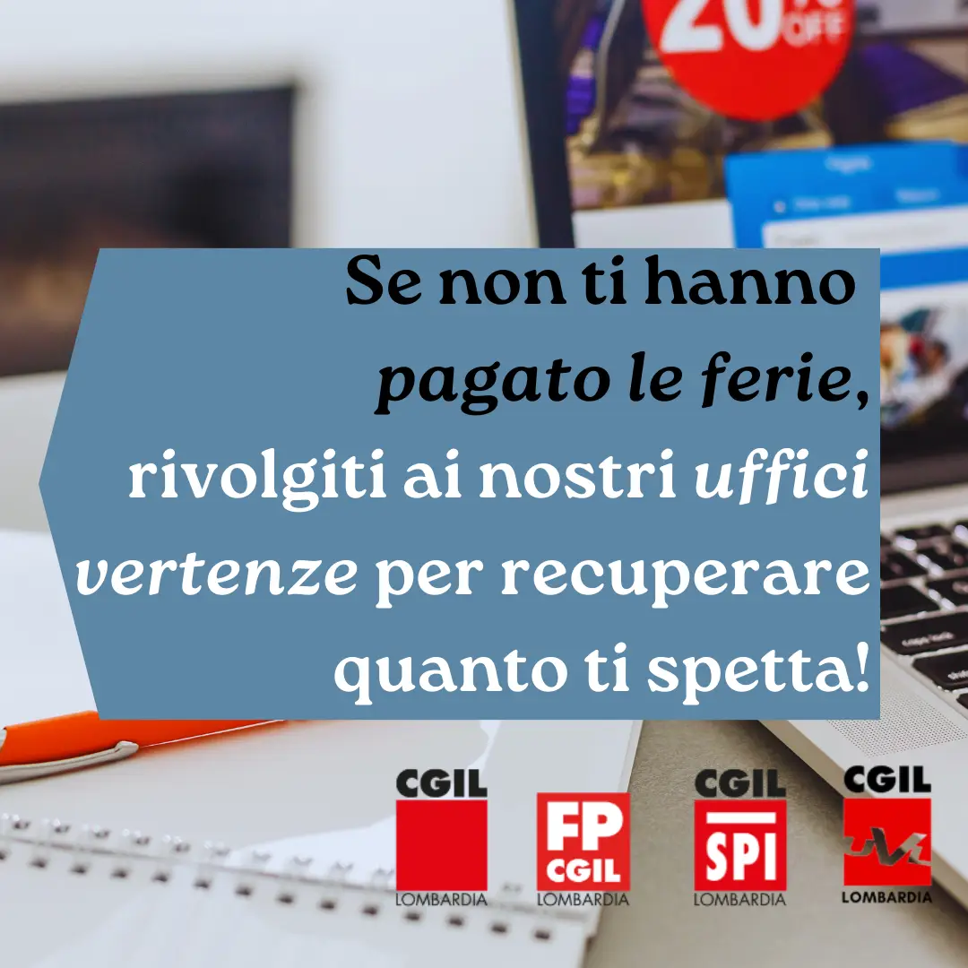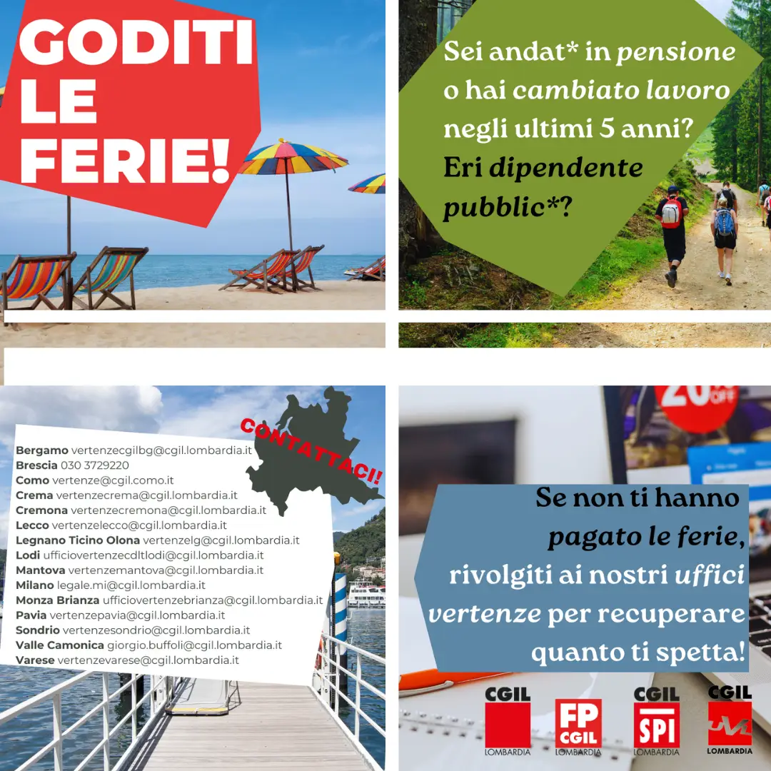 26 giu. 2024 – Con il titolo accattivante: “Goditi le ferie!”, è partita la campagna comunicativa della Cgil Lombardia – Confederazione, Funzione Pubblica, Sindacato Pensionati, Uffici Vertenze e Legali – sulla vertenza per monetizzare le ferie non saldate, appunto, a chi, alle dipendenze delle pubbliche amministrazioni, negli ultimi 5 anni ha cambiato ente tramite concorso oppure ha terminato di lavorare per andare in pensione.