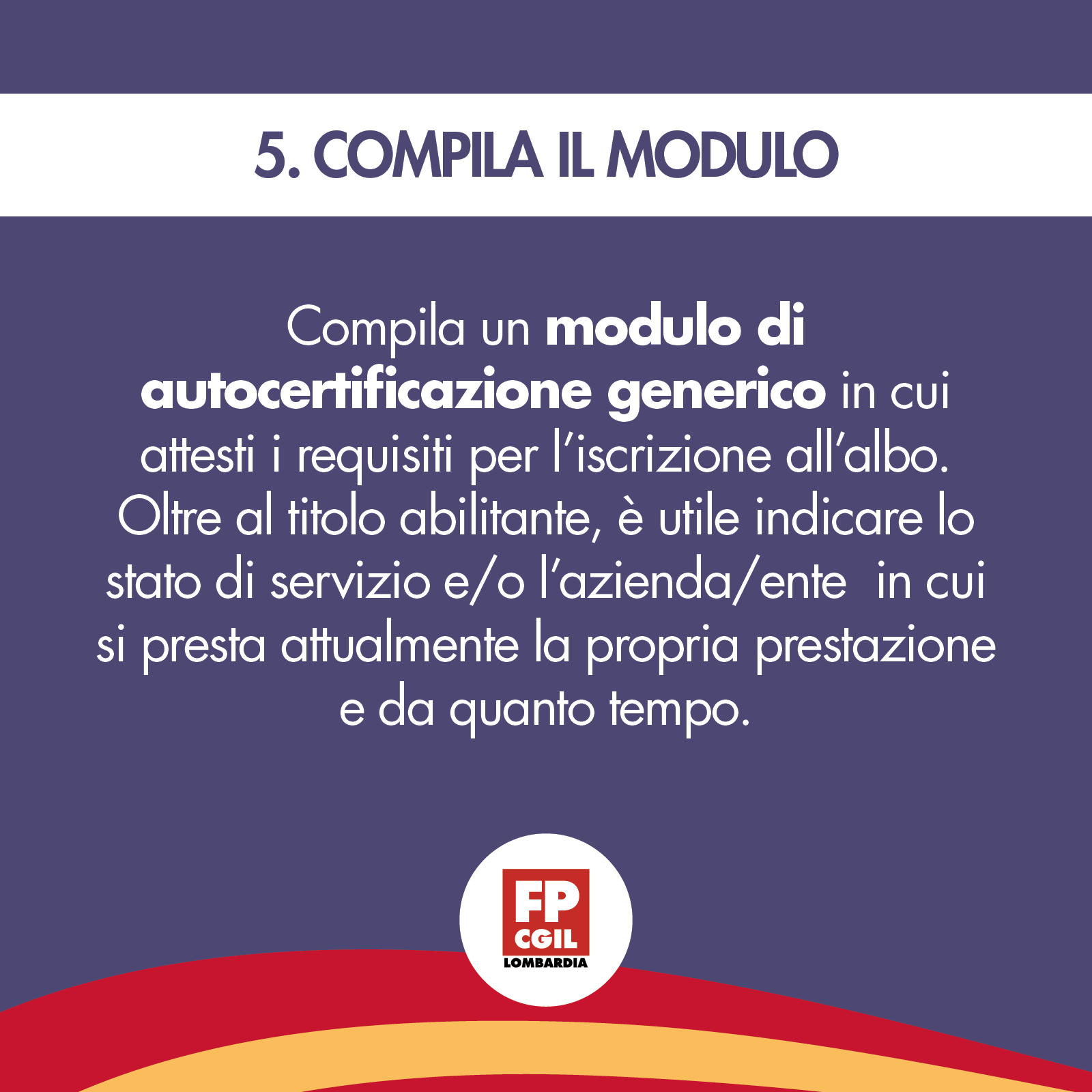 La Fp Cgil Lombardia ha già diffuso una prima brochure informativa (che include una scheda tecnica su come ci si iscrive all’albo), con tanto di Faq (che saranno via via implementate nella stessa pagina di questo articolo) e scheda tecnica. E hanno organizzato un’assemblea regionale on line per il 17 luglio.