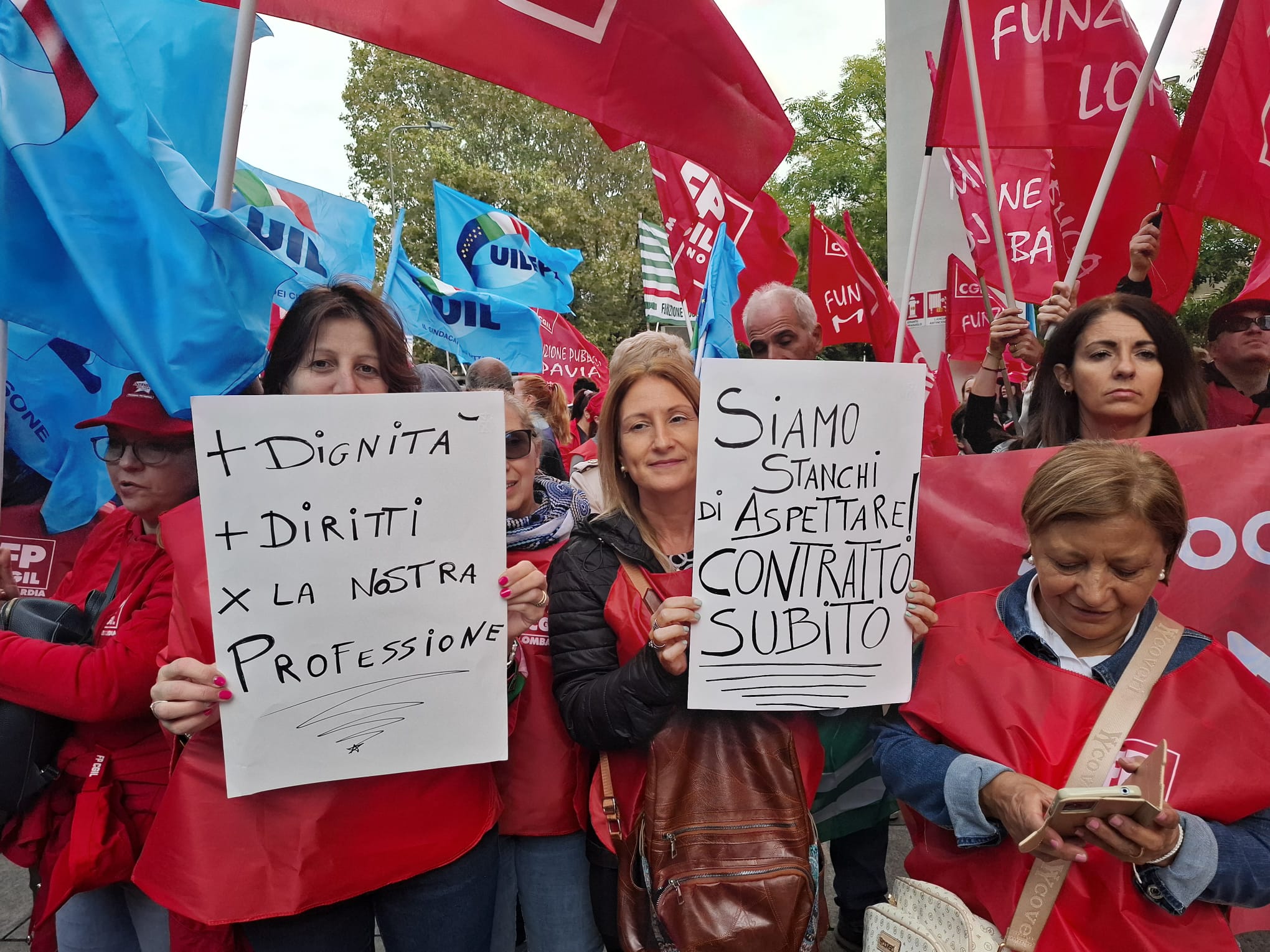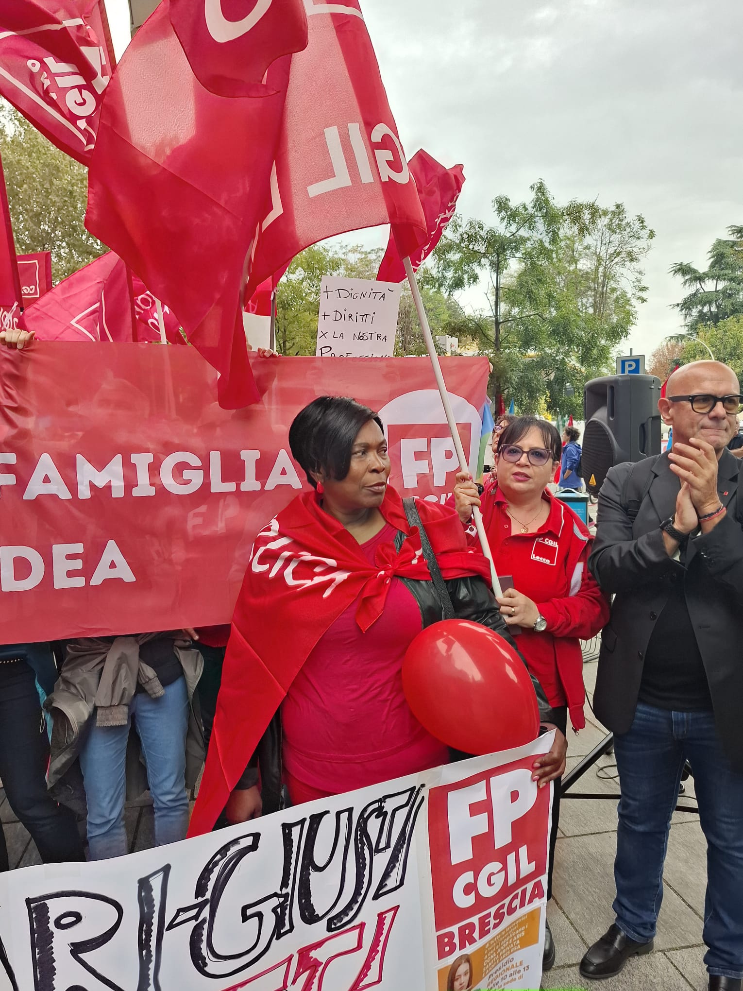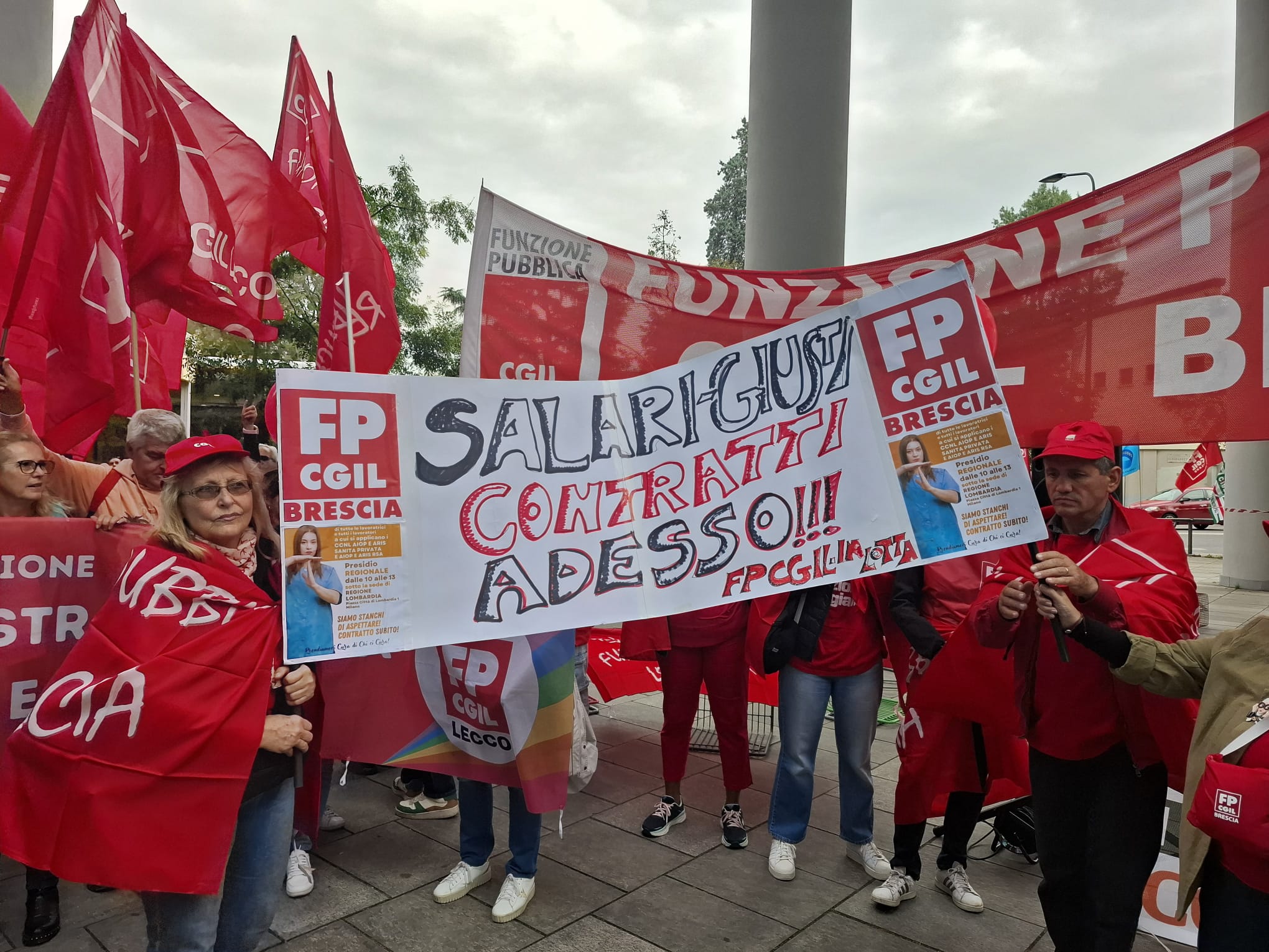 Il presidio è stato molto partecipato e colorato. Per la Fp Cgil, alla presenza del segretario nazionale Michele Vannini che ha tenuto le conclusioni, sono intervenuti: Loredana Baronio, operatrice socio assistenziale alla Fondazione Germani (Cr), Fabio Incerti, operatore dell’Associazione La Nostra Famiglia di Bosisio Parini (Lc), e Gianluca Cherchi, dell’Istituto Europeo di Oncologia di Milano.