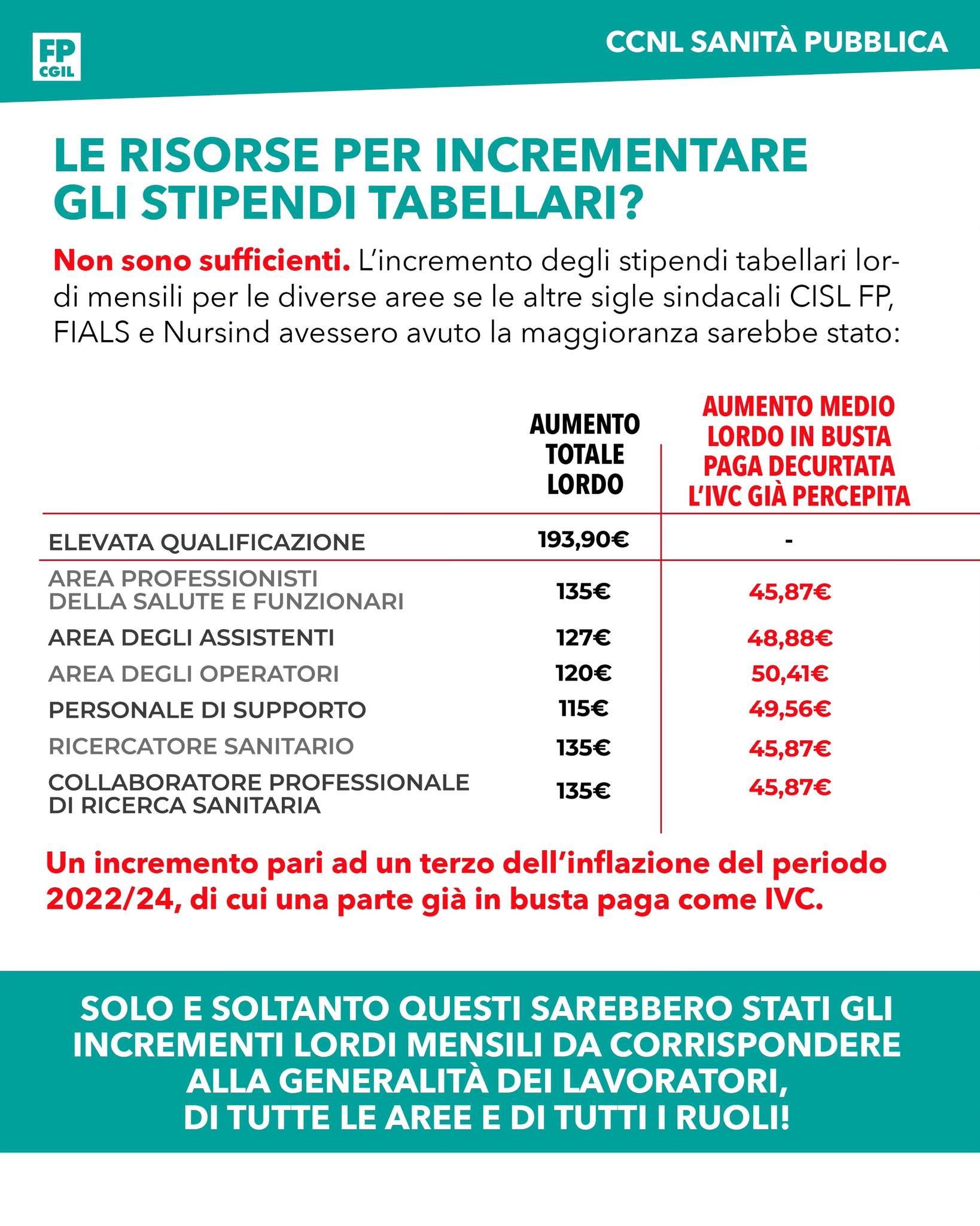 Non sono sufficienti. L’incremento degli stipendi tabellari lordi mensili per le diverse aree se le altre organizzazioni sindacali (CISL FP, FIALS e Nursind) avessero avuto la maggioranza sarebbe stato: