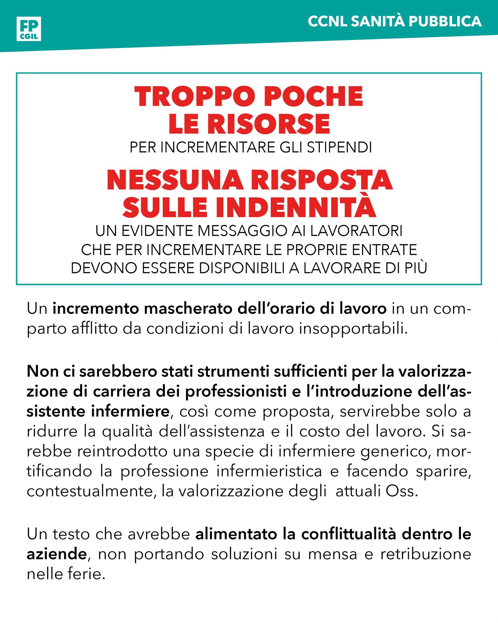 Troppo poche le risorse per incrementare gli stipendi, nessuna risposta sulle indennità, un evidente messaggio ai lavoratori che per incrementare le proprie entrate devono essere disponibili a lavorare di più. Un incremento mascherato dell’orario di lavoro in un comparto afflitto da condizioni di lavoro insopportabili.