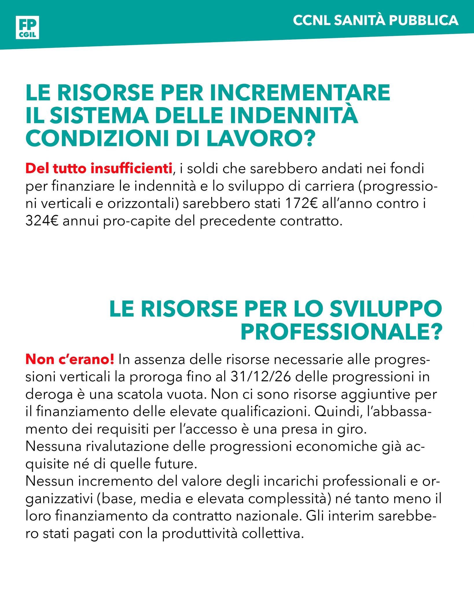 Del tutto insufficienti. I soldi che sarebbero andati nei fondi per finanziare le indennità e lo sviluppo di carriera (progressioni verticali e orizzontali) sarebbero stati 172 € all’anno contro i 324 € annui pro-capite del precedente contratto.