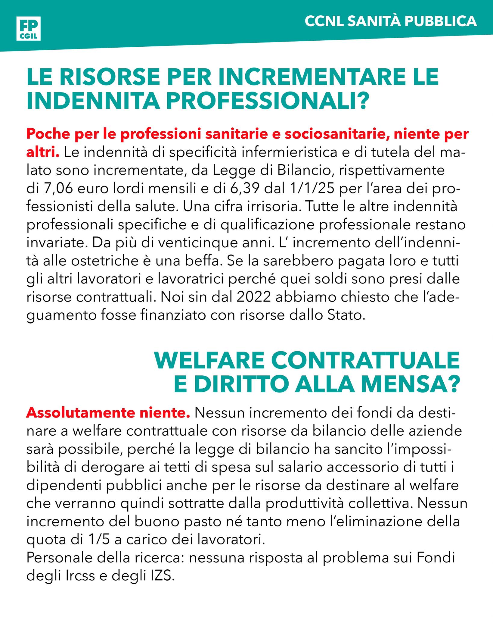 Poche per le professioni sanitarie e sociosanitarie, niente per gli altri. Le indennità di specificità infermieristica e di tutela del malato sono incrementate, da Legge di Bilancio, rispettivamente di 7,06 euro lordi mensili e di 6,39 euro lordi mensili dal 1° gennaio 2025 per l’area dei professionisti della salute. Una cifra irrisoria. Tutte le altre indennità professionali specifiche e di qualificazione professionale restano invariate,. Da più di venticinque anni. L’incremento dell’indennità alle ostetriche è una beffa. Se la sarebbero pagato loro e tutti gli altri lavoratori e lavoratrici perchè quei soldi sono presi dalle risorse contrattuali. Noi sin dal 2022 abbiamo chiesto che l’adeguamento fosse finanziato con risorse dello Stato.