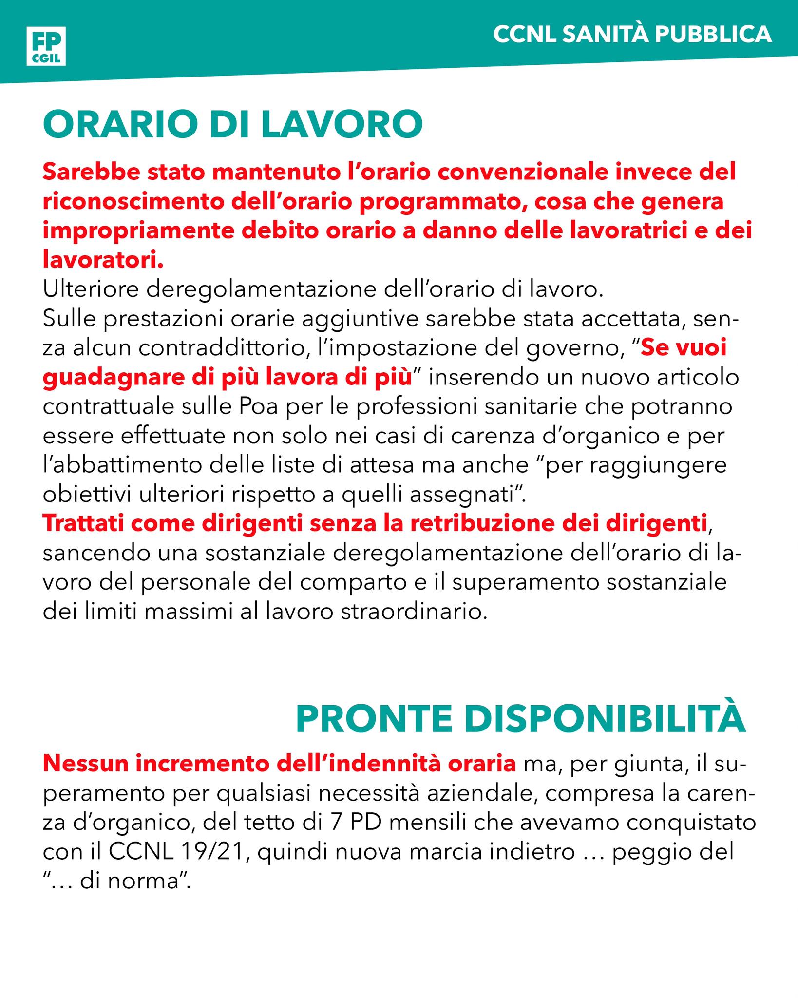 Sulle prestazioni orarie aggiuntive sarebbe stata accettata, senza alcun contraddittorio, l’impostazione del governo: “Se vuoi guadagnare di più, lavora di più” inserendo un nuovo articolo contrattuale sulle POA per le professioni sanitarie che potranno essere effettuate non solo nei casi di carenza d’organico e per l’abbattimento delle liste di attesa ma anche “per raggiungere obiettivi ulteriori rispetto a quelli assegnati”.