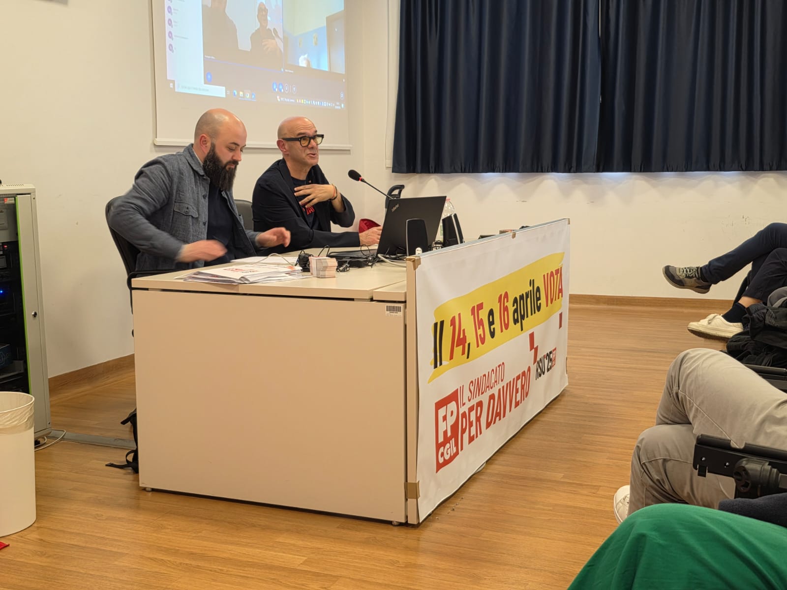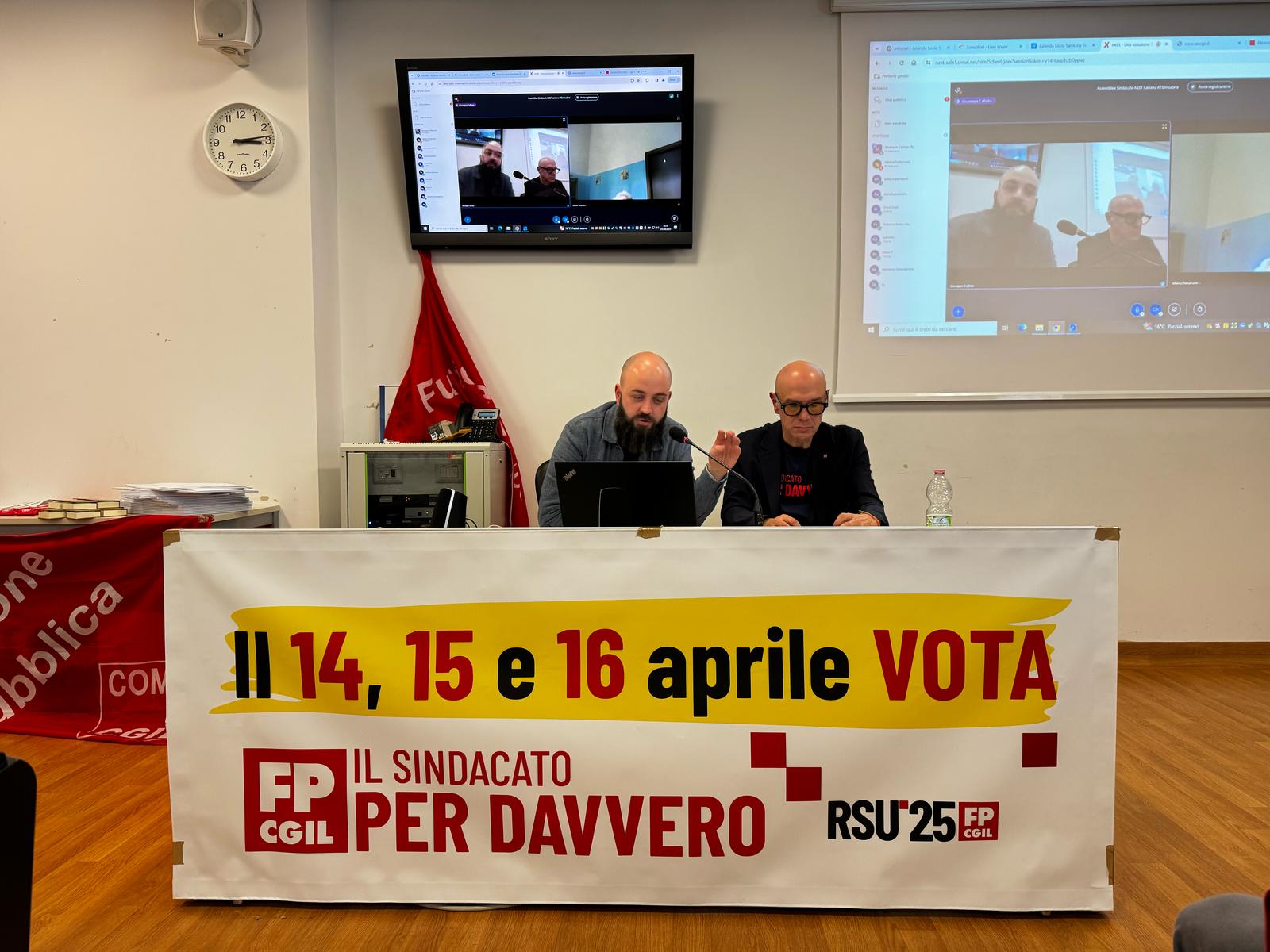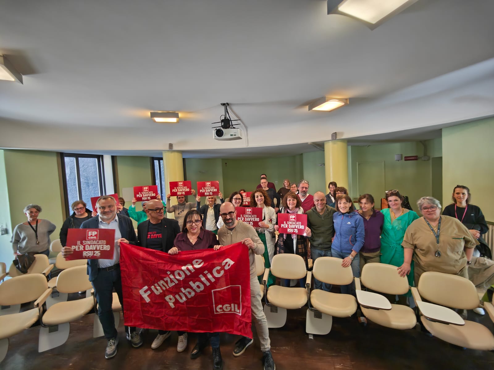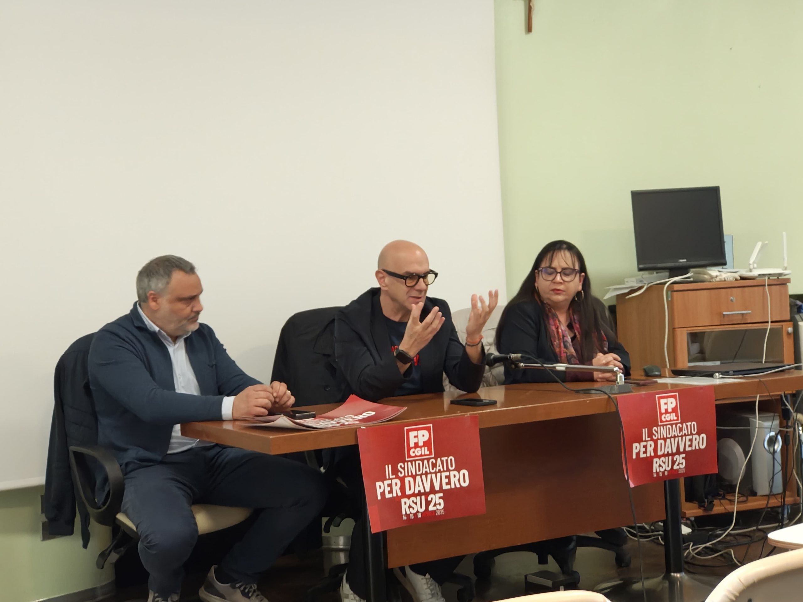 Assemblee attente, con lavoratrici e lavoratori della sanità, candidate e candidati, i gruppi dirigenti delle Fp Cgil territoriali, il segretario nazionale Michele Vannini e il segretario regionale Lello Tramparulo.