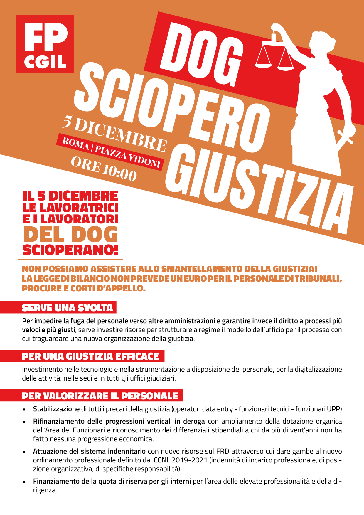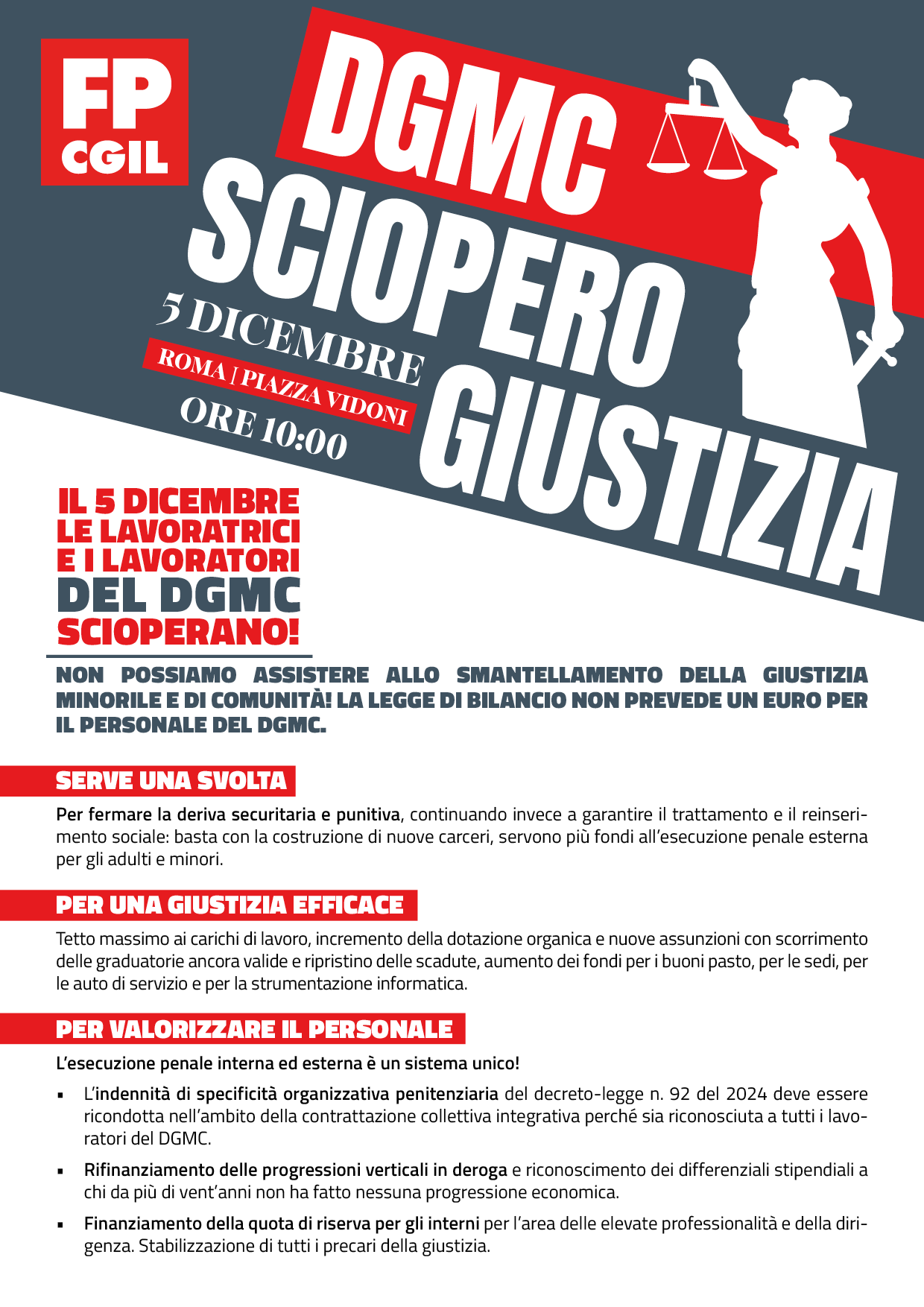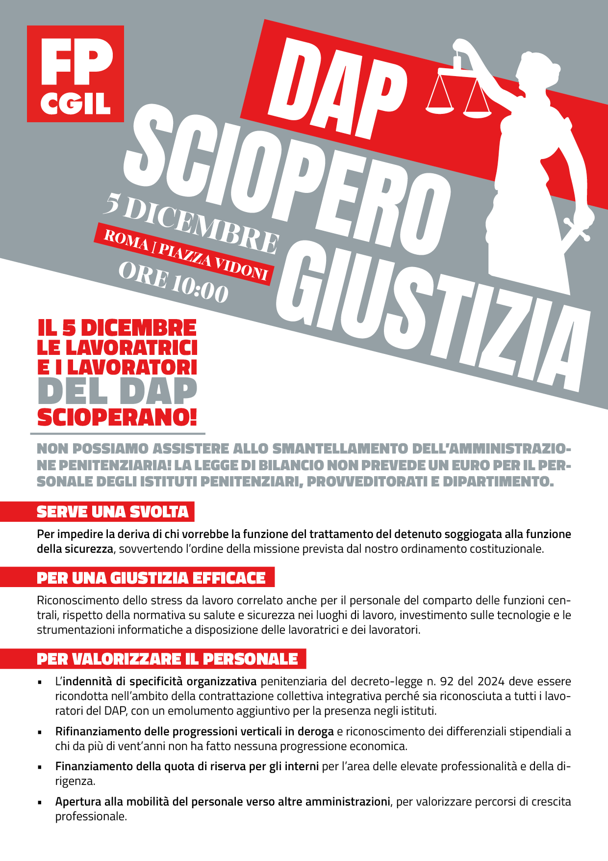 2 dic. 2025 – Per venerdì 5 dicembre la Fp Cgil ha proclamato lo sciopero delle lavoratrici e dei lavoratori della Giustizia nei tre Dipartimenti – Amministrazione Penitenziaria (Dap), Giustizia Minorile e di Comunità (Dgmc), Organizzazione Giudiziaria (Dog) – e all’Ufficio Centrale Archivi Notarili (Ucan).