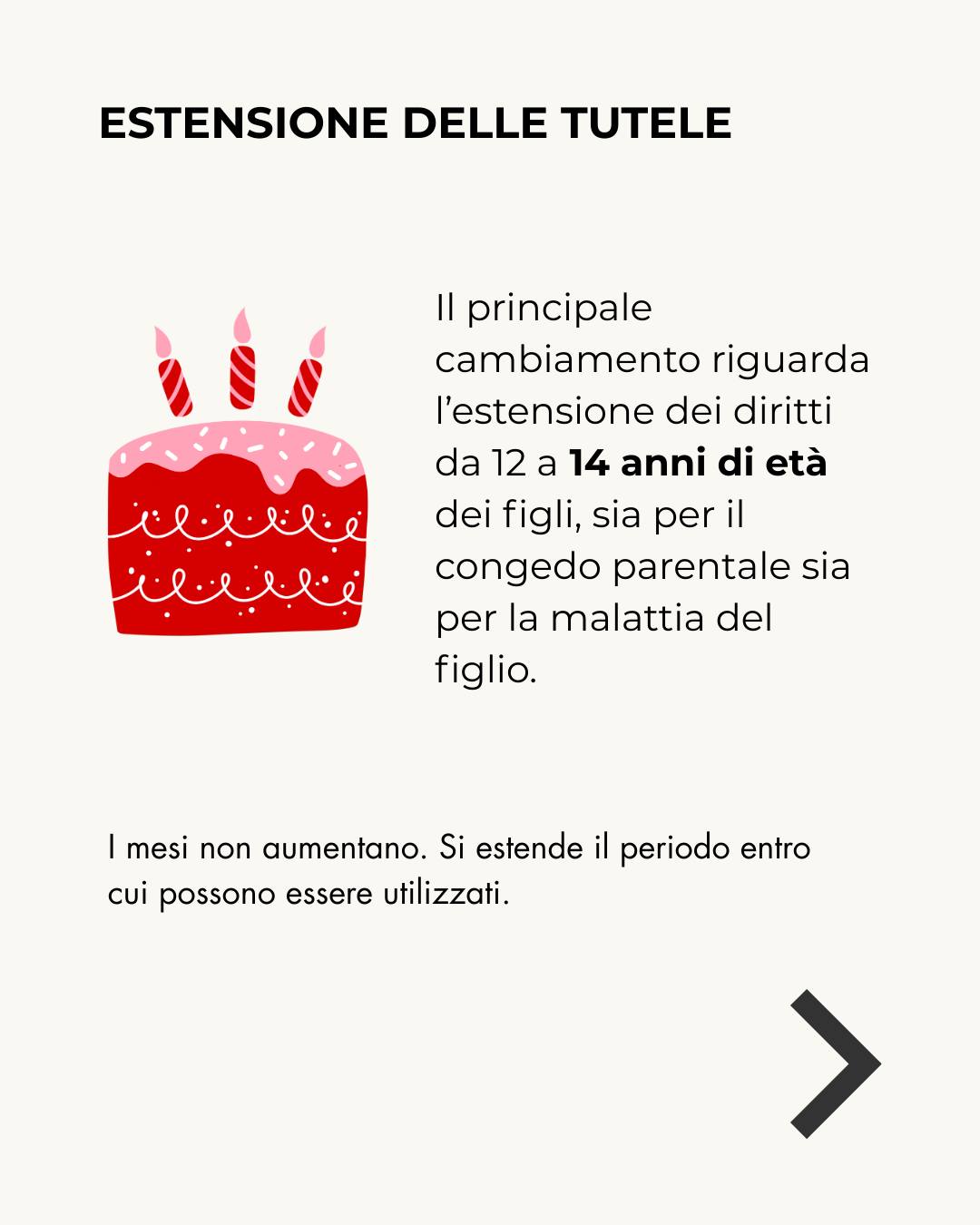 Il principale cambiamento riguarda l’estensione dei diritti da 12 a 14 anni di età dei figli, sia per il congedo parentale sia per la malattia del figlio.